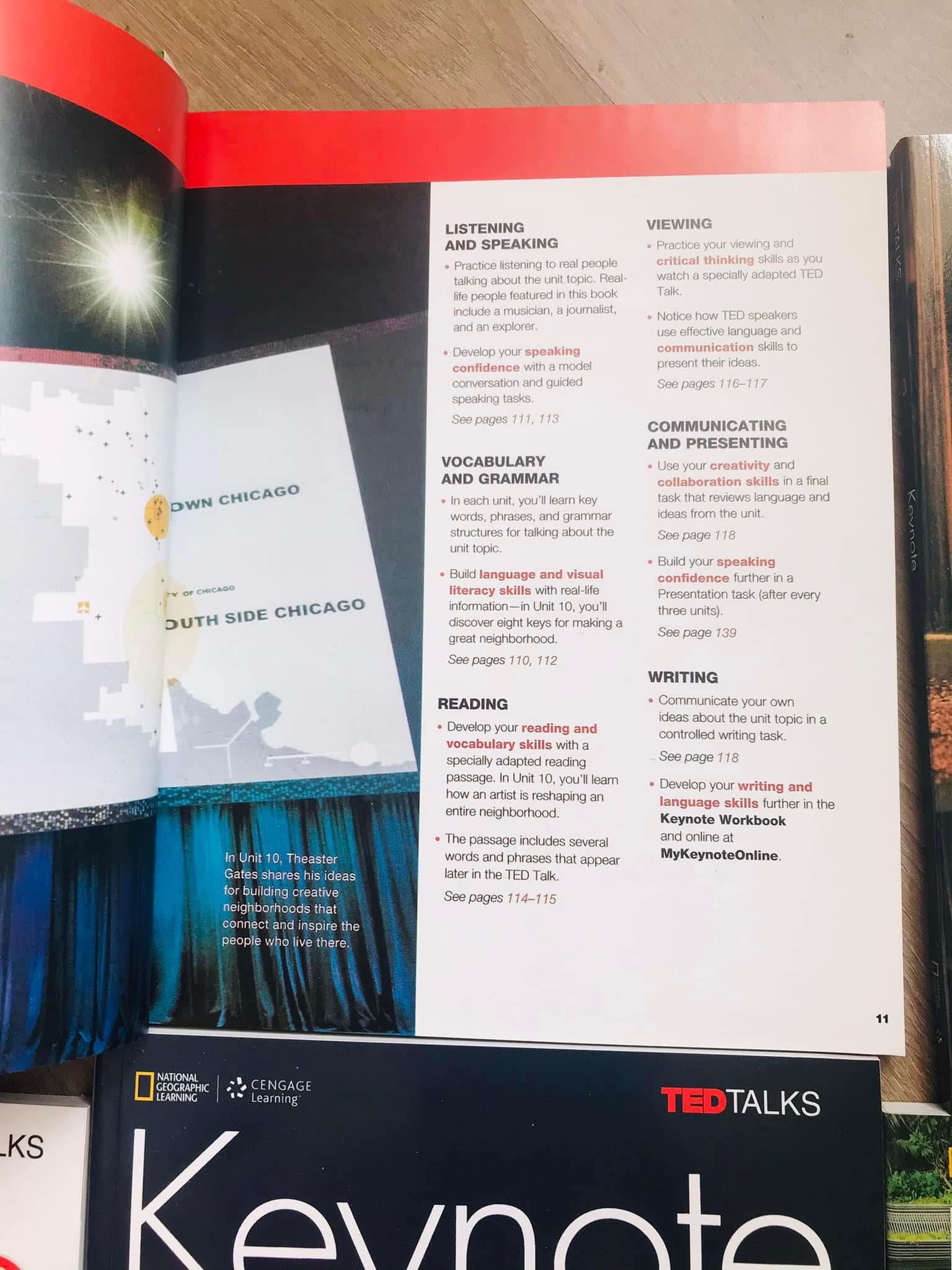 Mỗi bài có các bài tập đặc biệt cho kỹ năng thuyết trình (kỹ năng nói) và giao tiếp (giao tiếp bằng miệng).