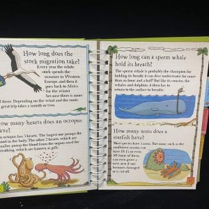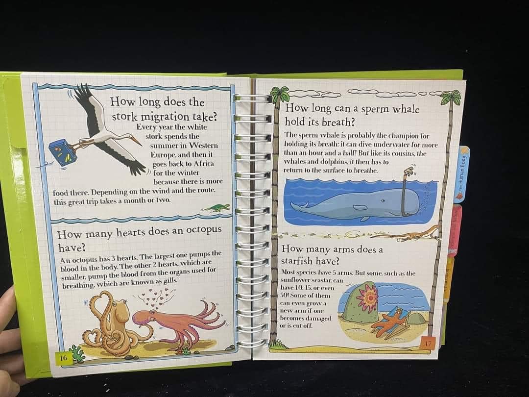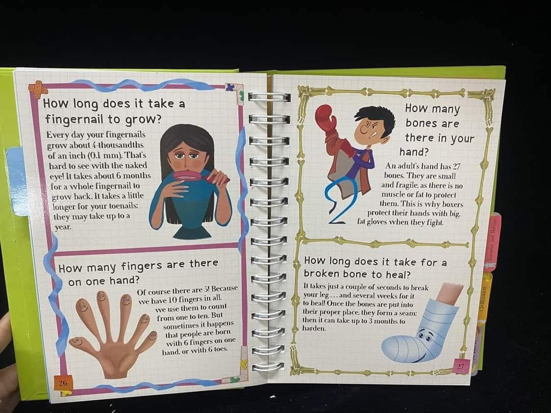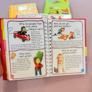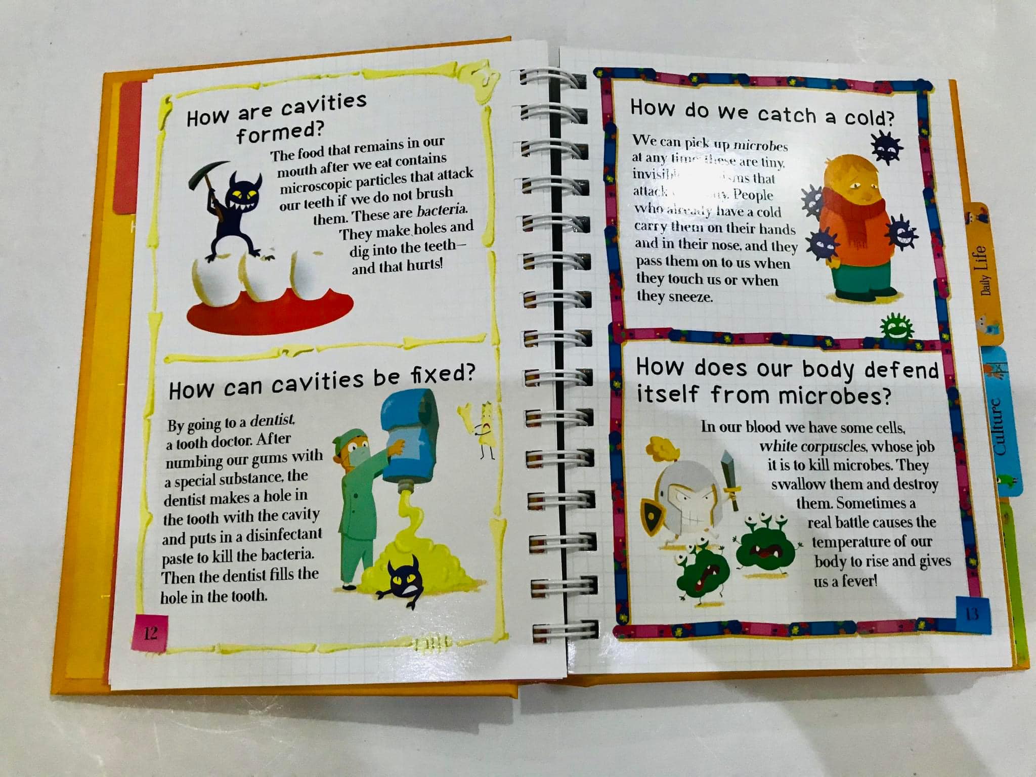 Cuốn sách rộng lớn bao gồm nhiều chủ đề khác nhau, từ trái đất, vũ trụ, động thực vật, lịch sử, cơ thể con người và nhiều hơn nữa. Với hình ảnh đẹp mắt và thú vị, trẻ em sẽ tìm thấy hơn 200 câu hỏi và câu trả lời về các chủ đề này.