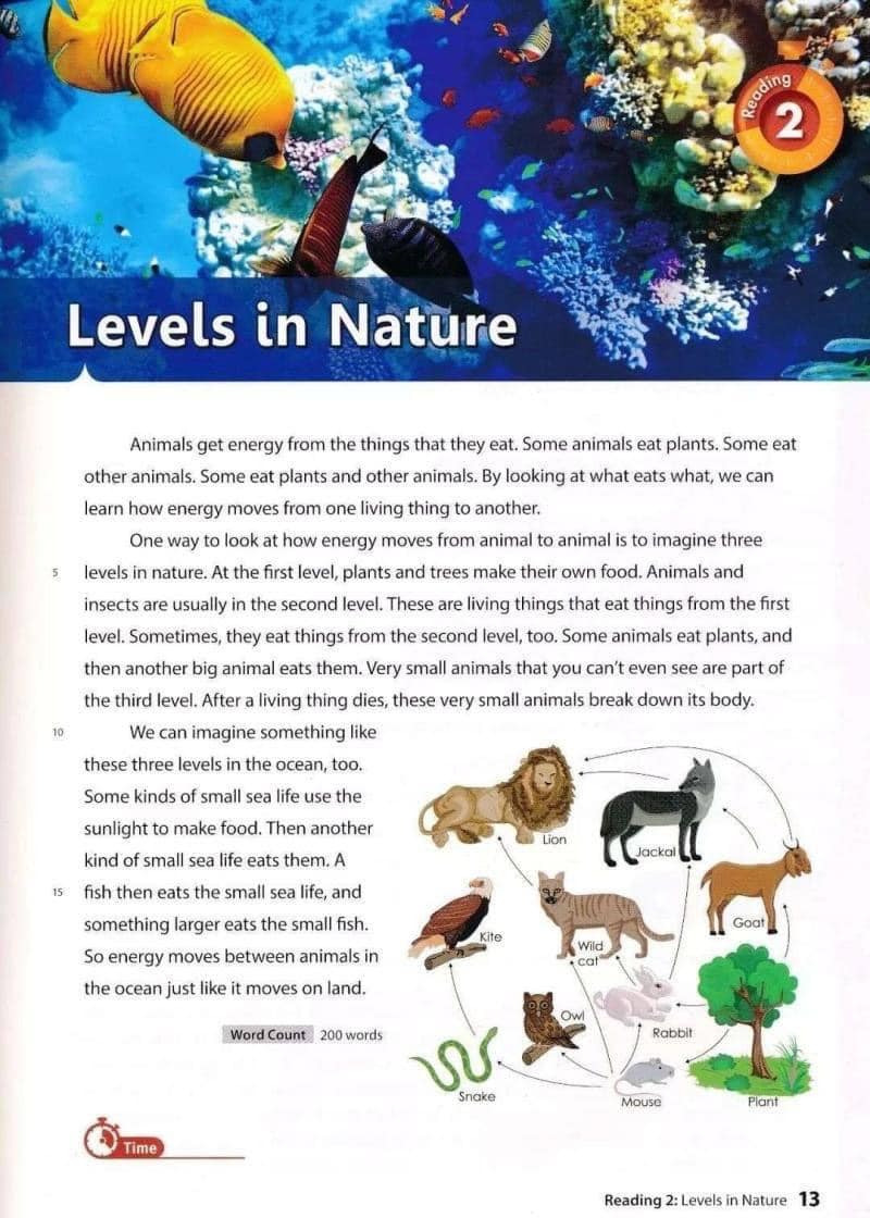 Ví dụ, Level 1 có Nature (tự nhiên), Music(âm nhạc), Health(sức khỏe), Education(giáo dục),Business(kinh doanh), Food(thực phẩm), Sports(thể thao), People(người). Trong mỗi chủ đề lại có 5 bài viết liên quan đến nhau.